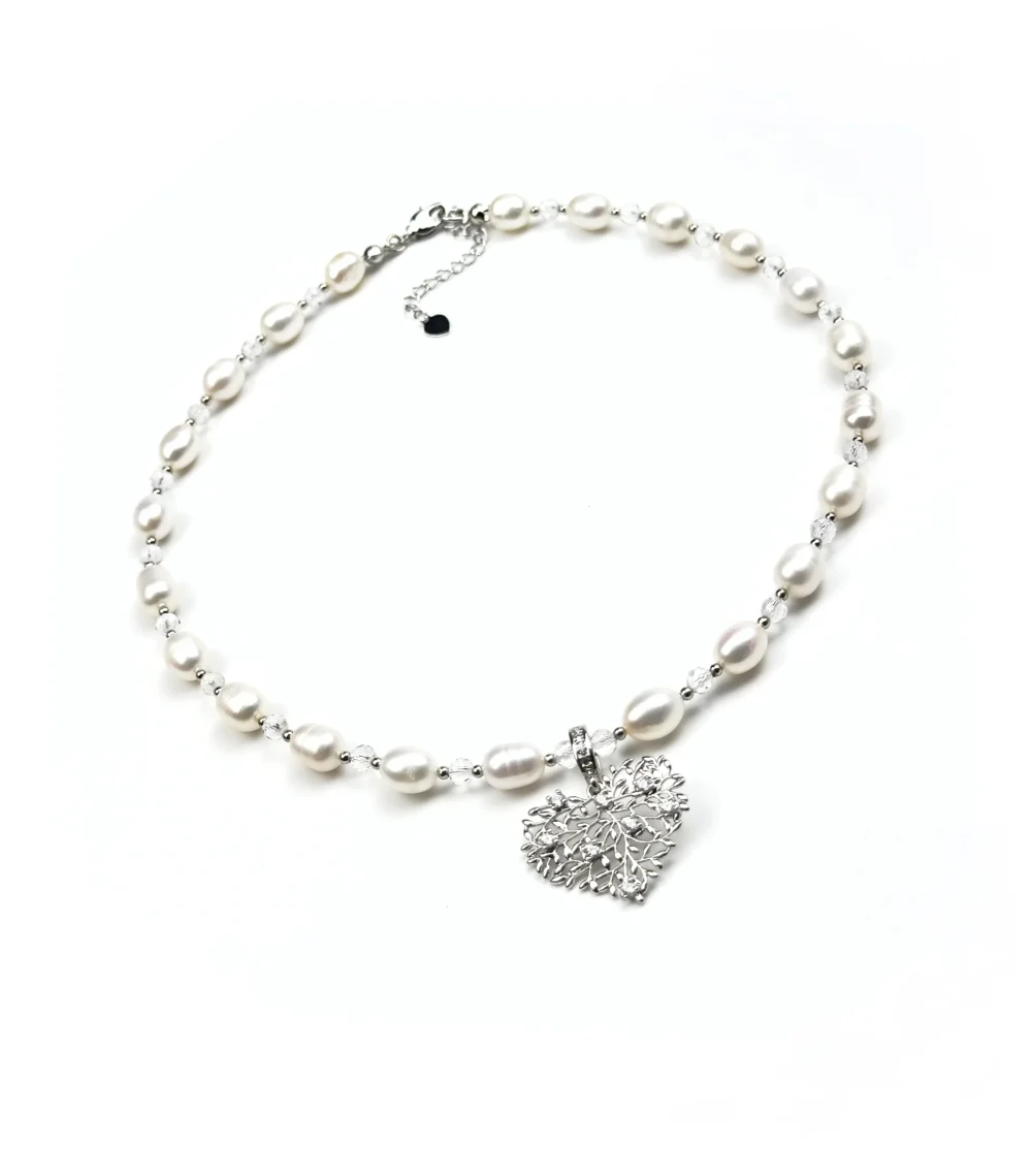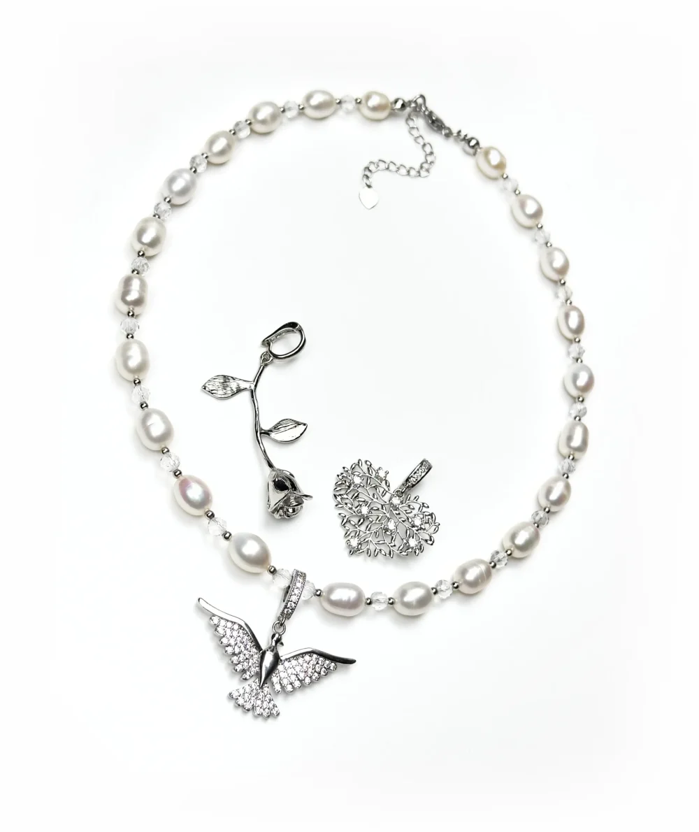 Состав изделия: натуральный жемчуг, горный хрусталь в ювелирной огранке, подвеска на выбор (Сердце, Роза, Феникс)