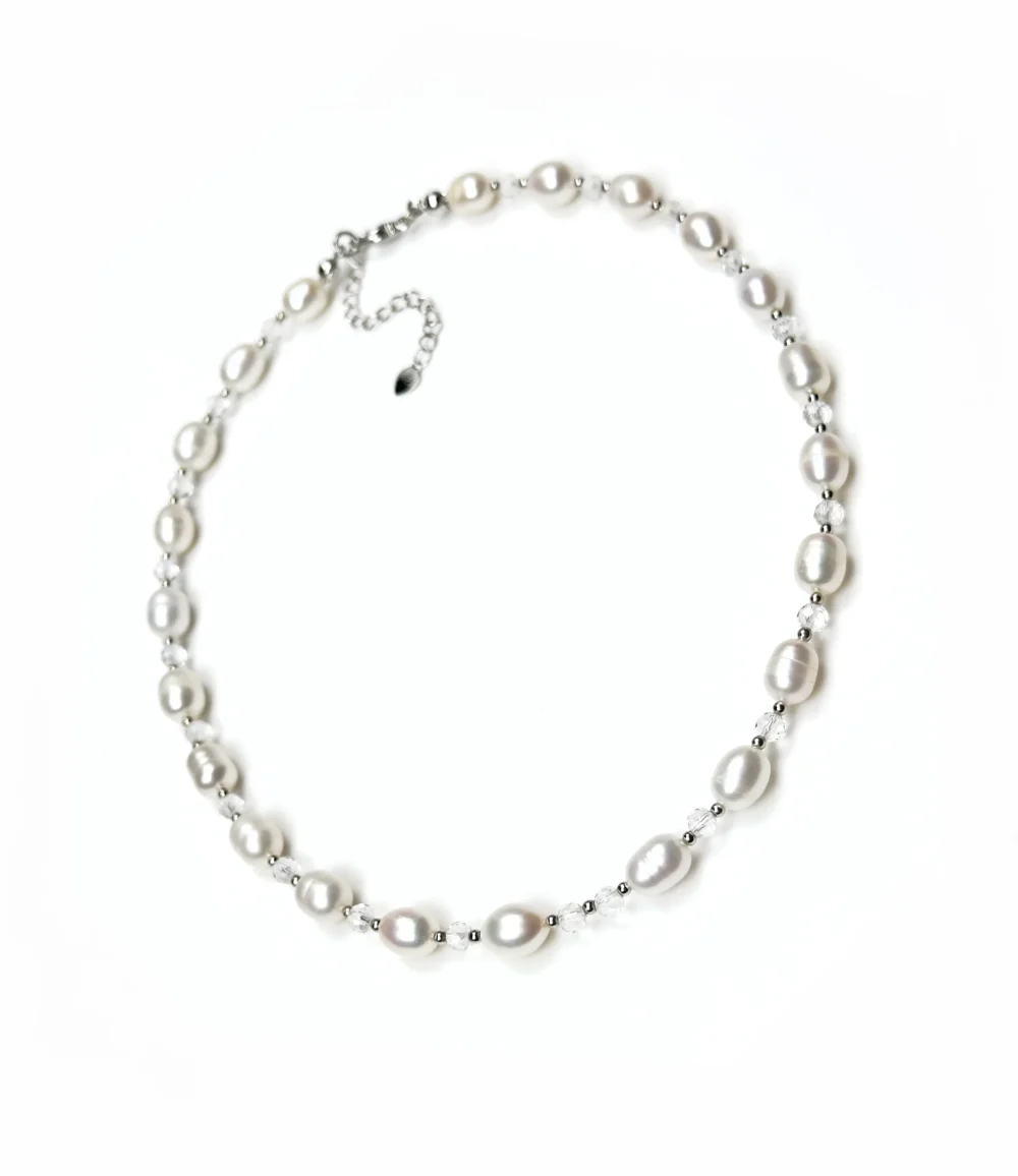 Колье выполнено из натурального высококачественного жемчуга и натурального горного хрусталя в ювелирной огранке.