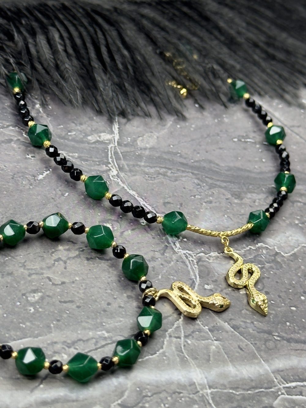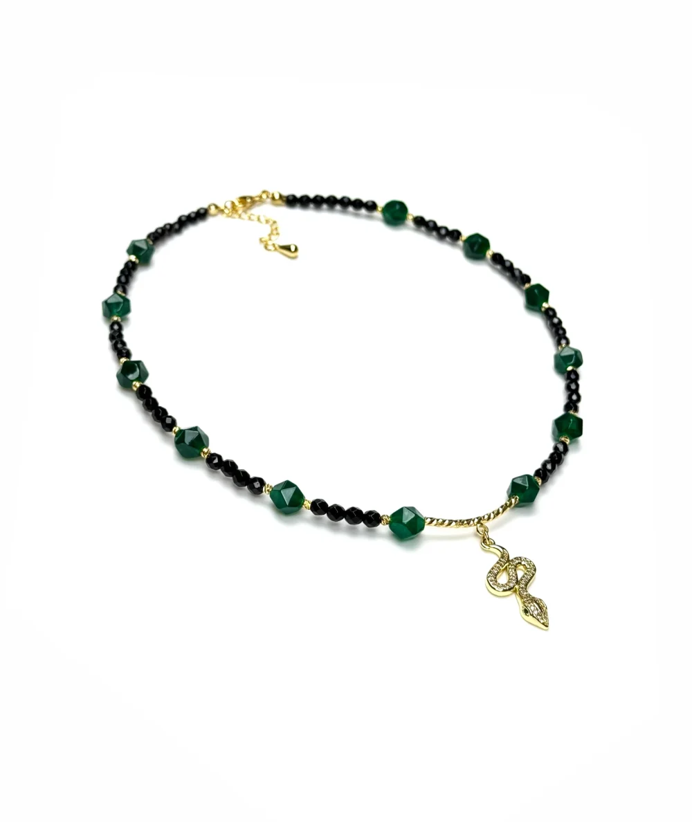 Состав изделия: зеленый агат в крупной огранке, черный агат в огранке, инкрустированная подвеска в виде змейки с зелеными фианитовыми глазками