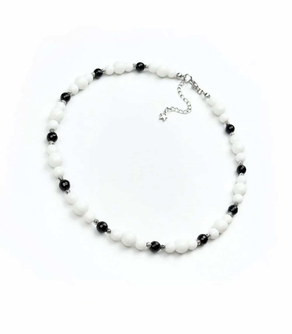Колье Шахматная Королева выполнено из сочетания натурального черного и белого агата в элегантной огранке, которое является воплощением единства противоположностей, создавая гармоничное сочетание света и тьмы, строгости и изящества.