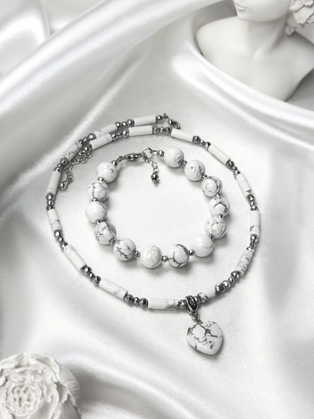 Состав изделий: магнезит, гематит в огранке, подвеска Сердце из магнезита, фурнитура премиум-класса