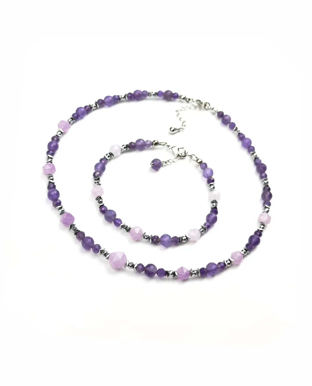 Аметист с его бархатной фиалковой глубиной и гематит — с дерзким металлическим блеском. Два камня, соединенных в эффектный контраст, напоминающий о гармонии противоположностей.