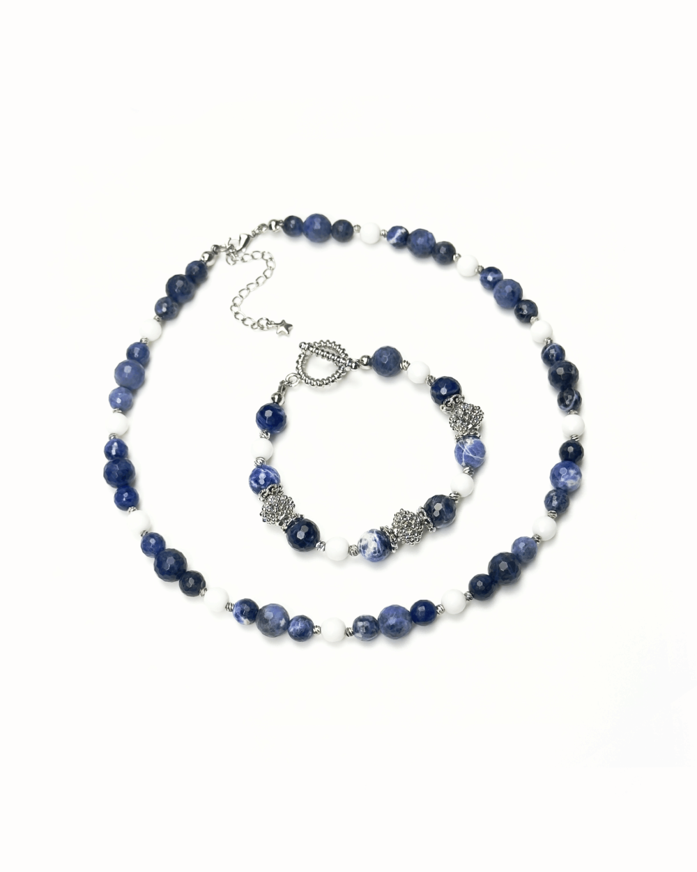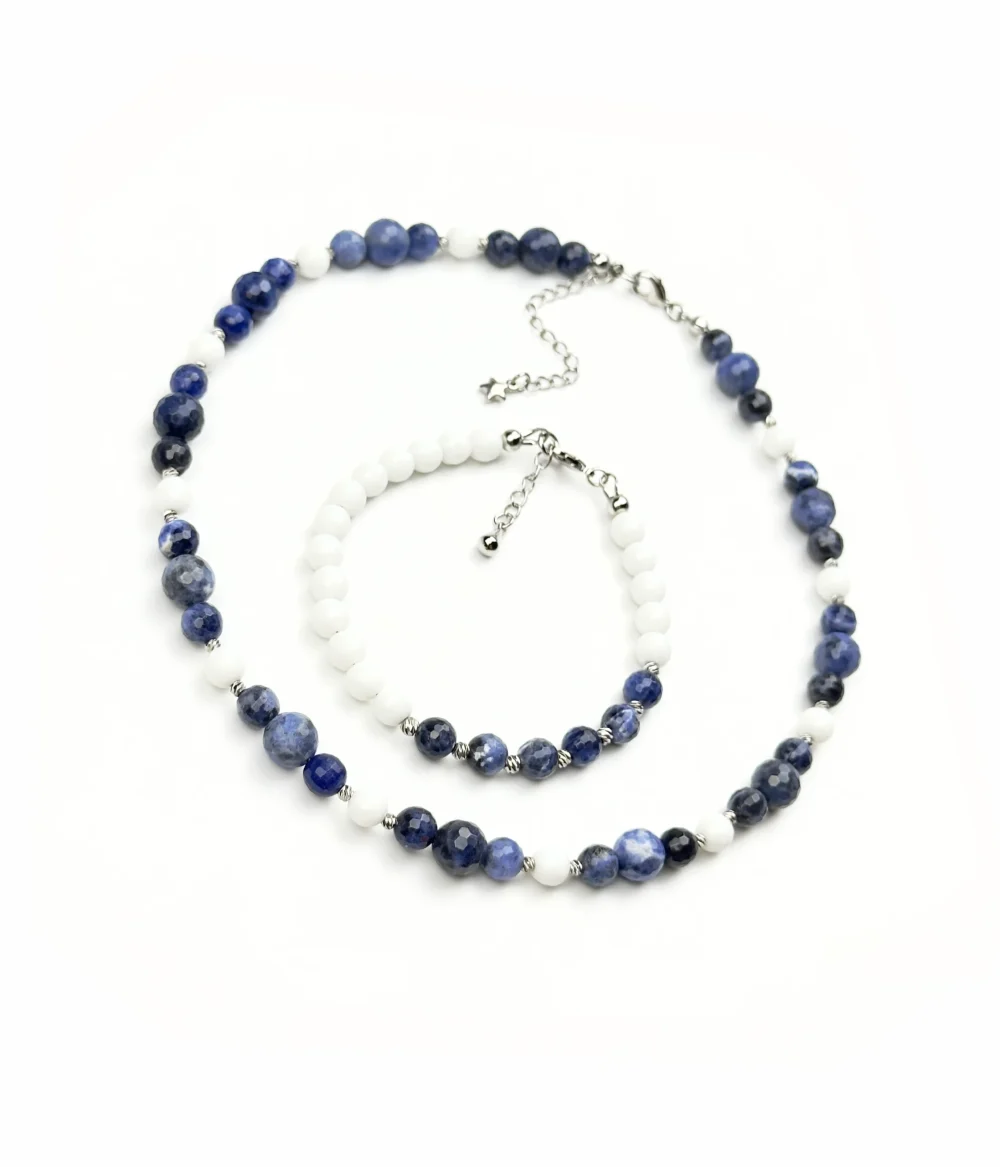Содалит обостряет внутреннее зрение, помогая различать оттенки истины. Белый агат создает кристально чистое пространство, где мысли обретают ясность.