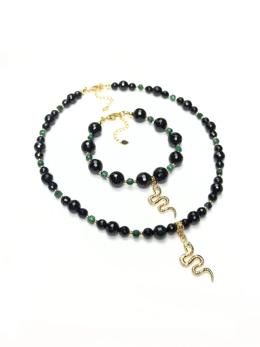 Набор ЗОЛОТАЯ ЗМЕЙКА – это яркое и необычное украшение, выполненное из натуральных камней: черного граненного агата, который добавляет мистики и глубины, и малахита, олицетворяющего связь с природой.