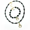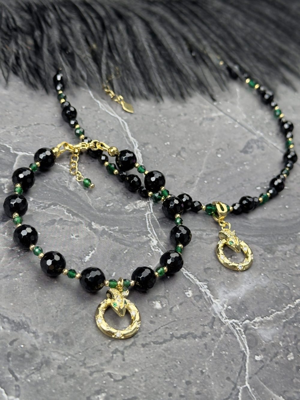 Состав изделий: черный агат, зеленая шпинель (искусственно выращенная) в ювелирной огранке, подвески в виде змейки, инкрустированные фианитами