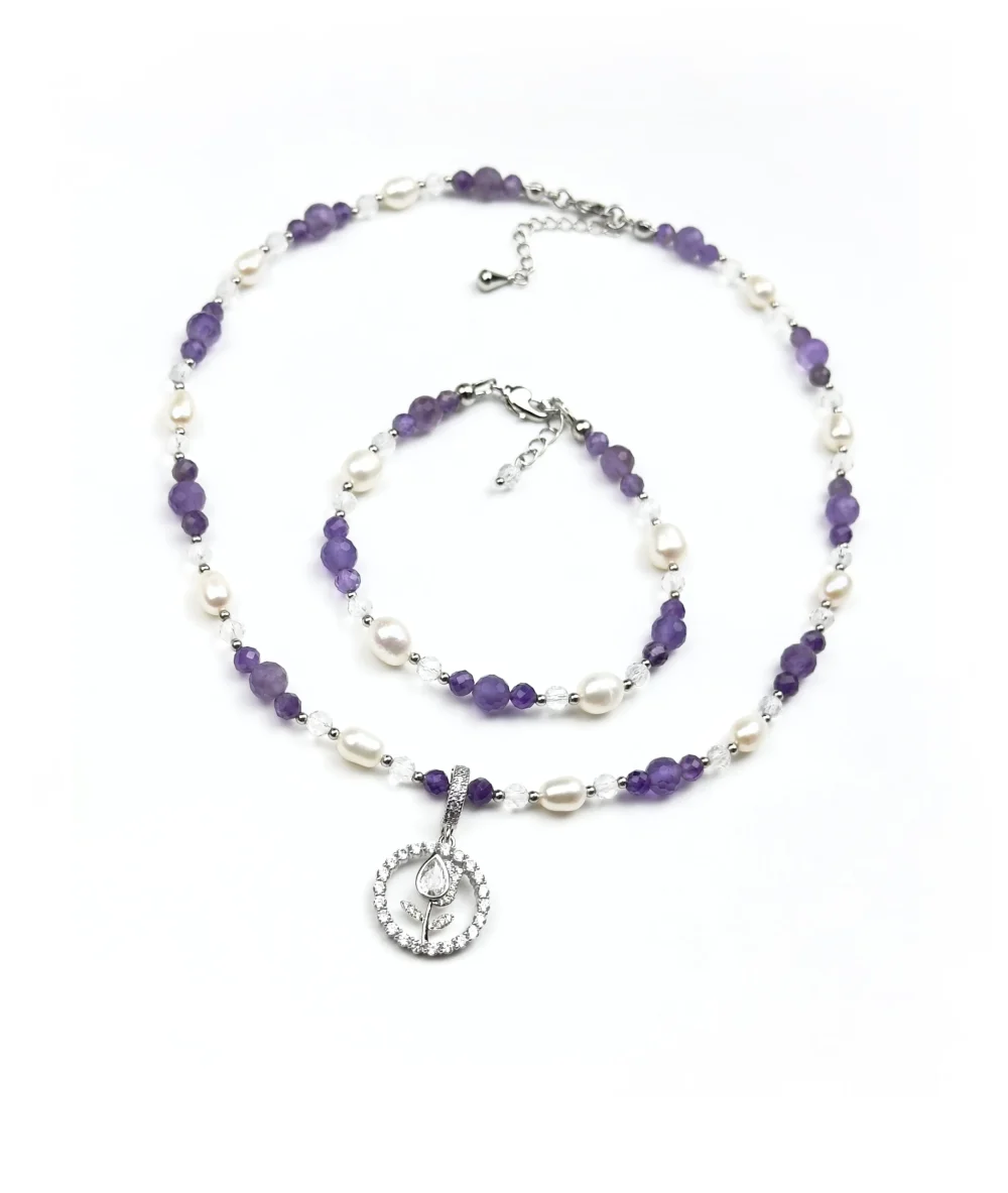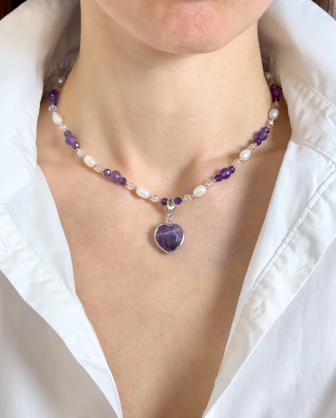 Жемчуг, аметист и горный хрусталь — три ноты одной мелодии. Перламутровая мягкость, лавандовая глубина и кристальная ясность. Свет играет на гранях, но не кричит — шепчет. Он нашептывает историю нежности — где глубина рождается из лёгкости, а сила скрыта в изяществе.