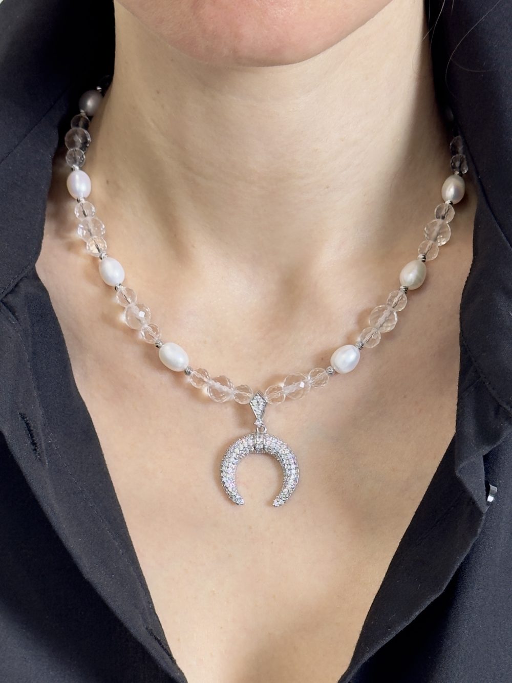 Состав изделий: натуральный жемчуг, горный хрусталь в огранке, подвески в виде лун, инкрустированные фианитами