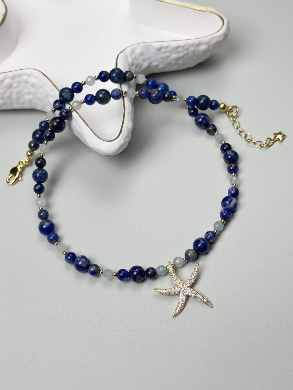 Состав изделий: лазурит, аквамарин в ювелирной огранке, инкрустированные подвески Морская звезда и Морская звездочка
