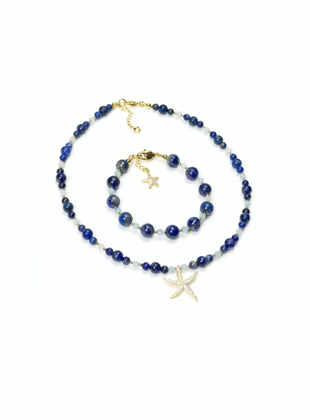 Откройте для себя магию морских глубин с набором МОРСКАЯ ЗВЕЗДА, выполненным из натурального лазурита и аквамарина в ювелирной огранке.