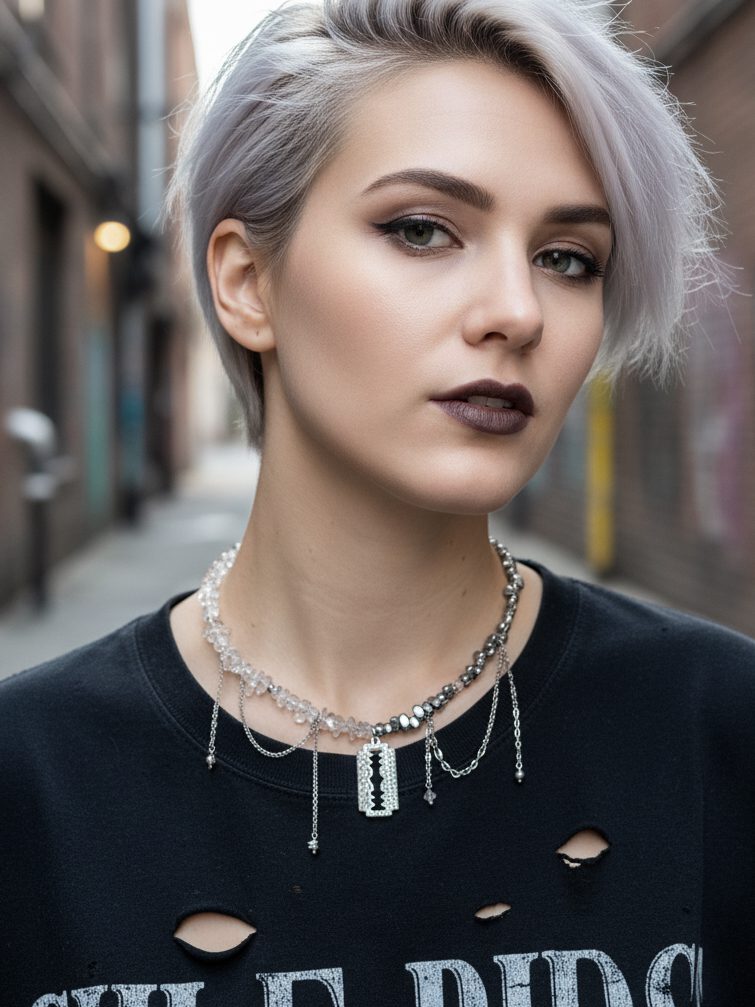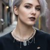 Колье дополнено изящными цепями, которые привносят в образ особый шарм. Выразительная подвеска в виде бритвы усиливает дизайн, намекая на смелость и бесстрашие обладательницы.