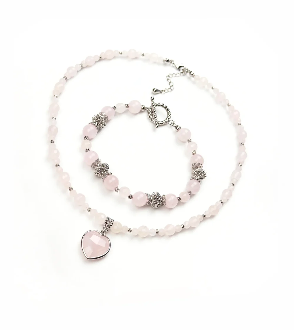 Состав изделий: мадагаскарский розовый кварц, подвеска Сердце из натурального розового кварца, ажурные бусины-вставки