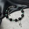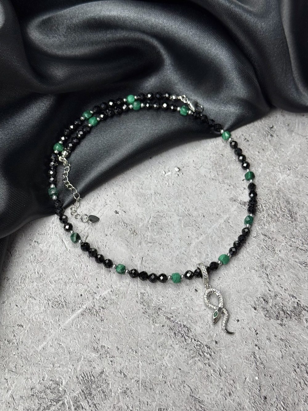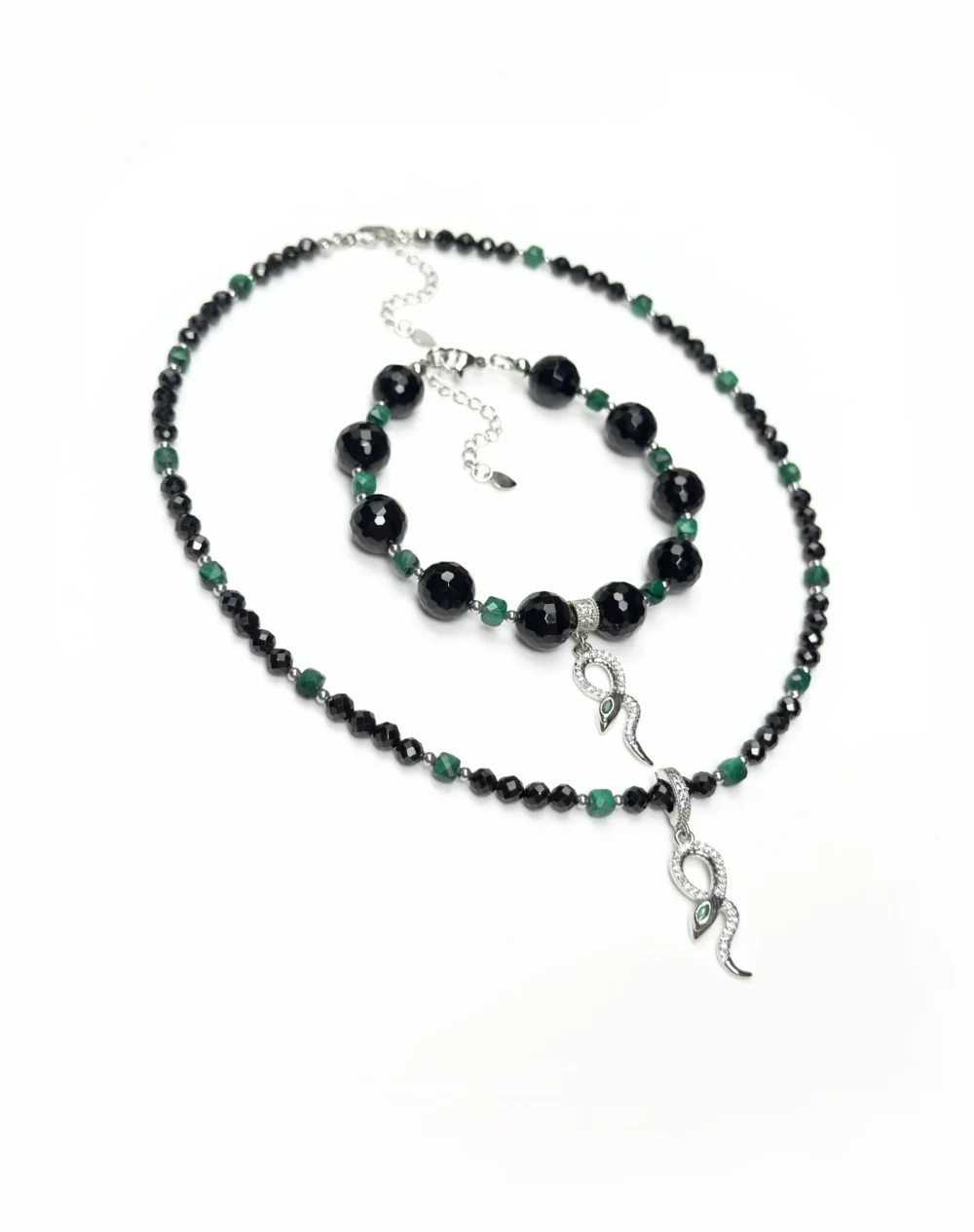 Состав изделий: агат, черная шпинель, малахит в форме кубов в ювелирной огранке, инкрустированная подвеска в виде змейки с зеленым фианитовым глазком
