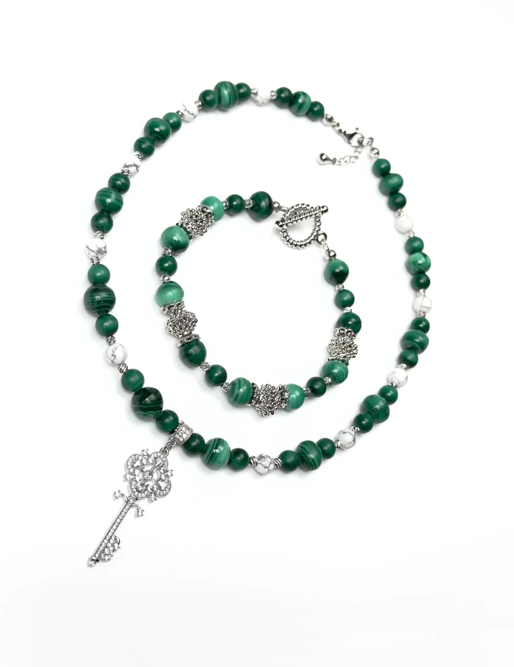 Состав изделий: малахит, магнезит, подвеска Ключик с фианитами, ажурные бусины-вставки, витой замок-тогл