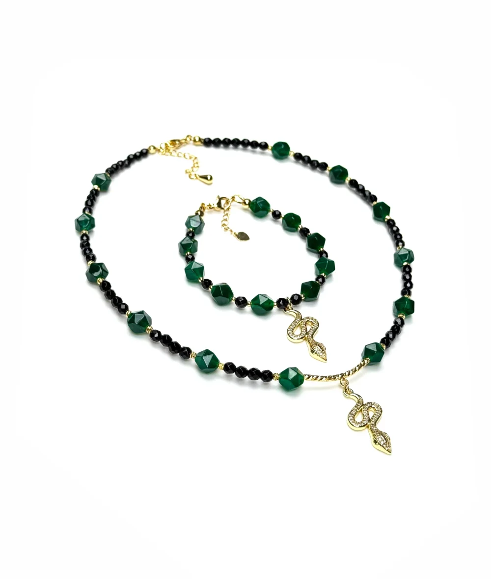 Зелёный агат словно змеиная кожа и чёрный агат, глубокий, как ночь в песках. Их контраст — диалог между жизнью и тайной, воплощённый в камне.