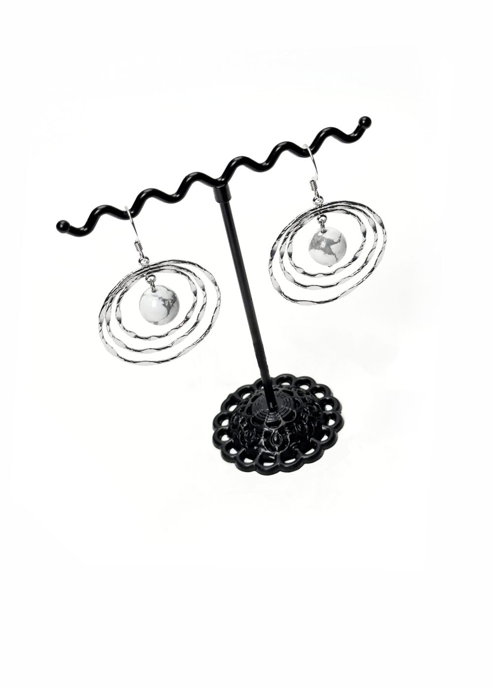 Белоснежный магнезит с мраморными разводами, напоминающий остывший пепел древнего священного костра. Эти серьги — воплощение умиротворения и чистоты, прикосновение прохлады после внутреннего очищения.
