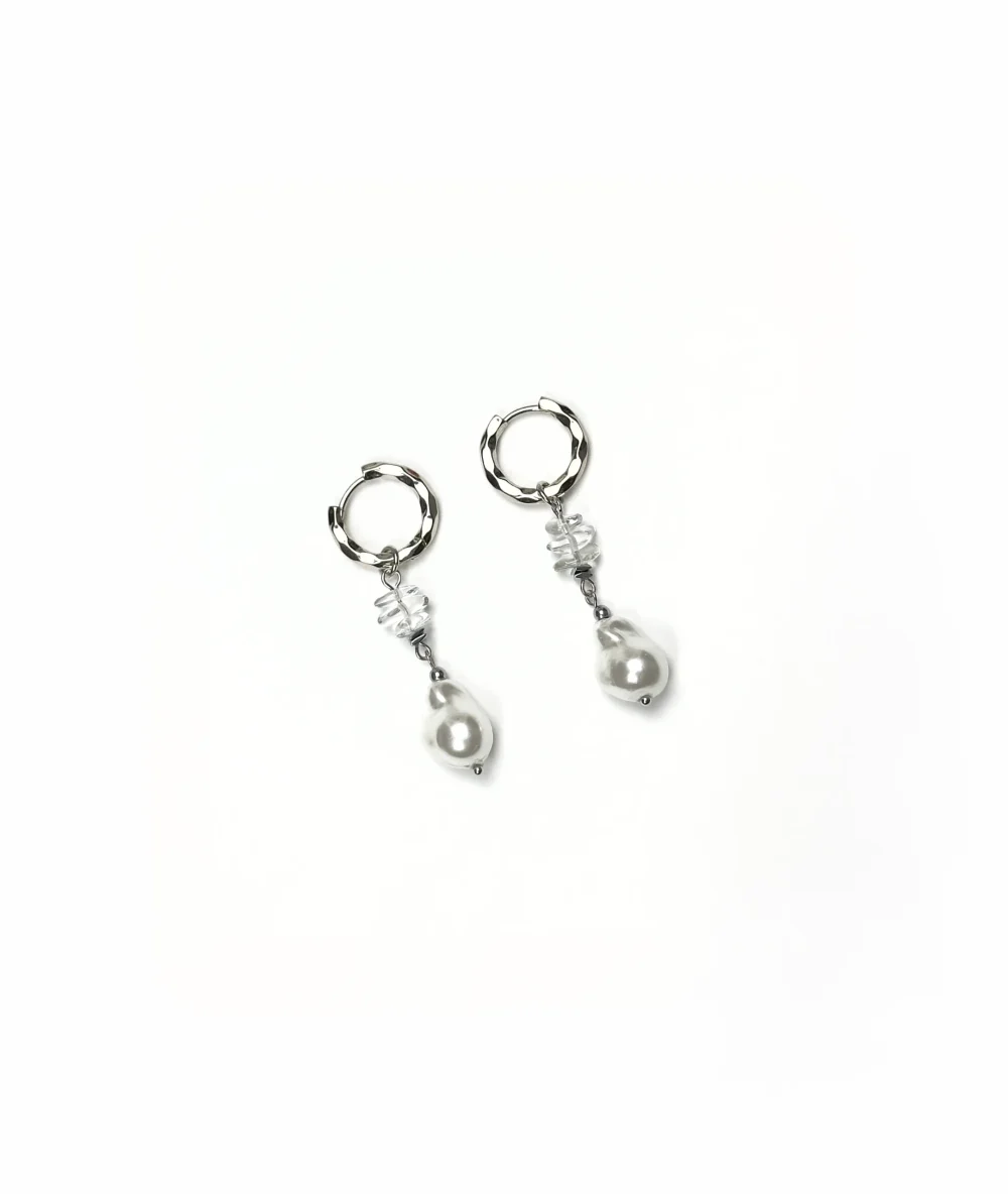 Основа – легендарные и всеми любимые серьги конго. Подвески выполнены из натурального горного хрусталя фриформ и с элегантной вставкой в виде капли, выполненной из жемчуга майорка.