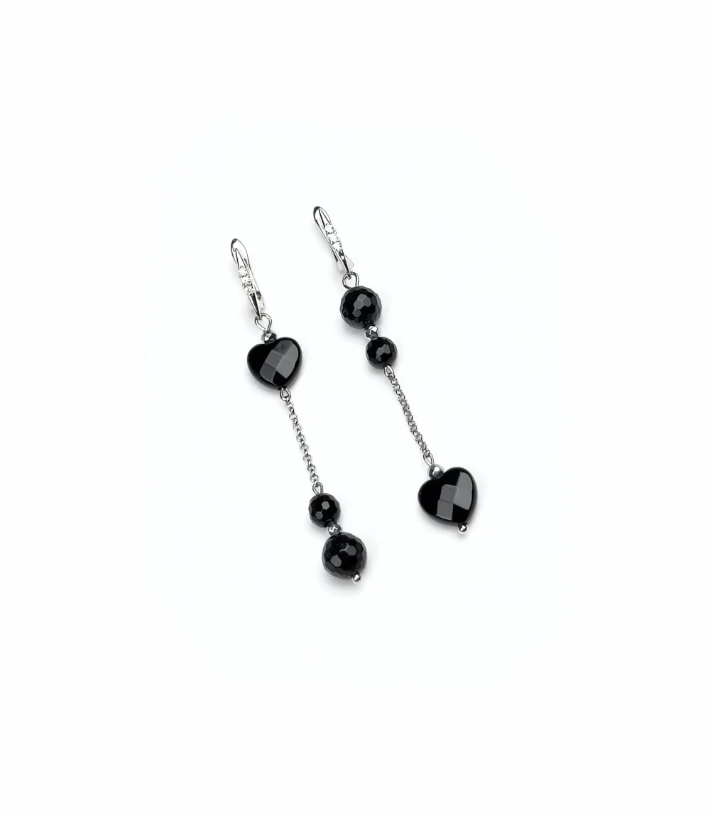 Серьги СТАЛЬНОЕ СЕРДЦЕ — это сочетание силы и элегантности, созданное из натурального черного агата, ограненного в форме сердец, и сверкающего гематита.