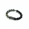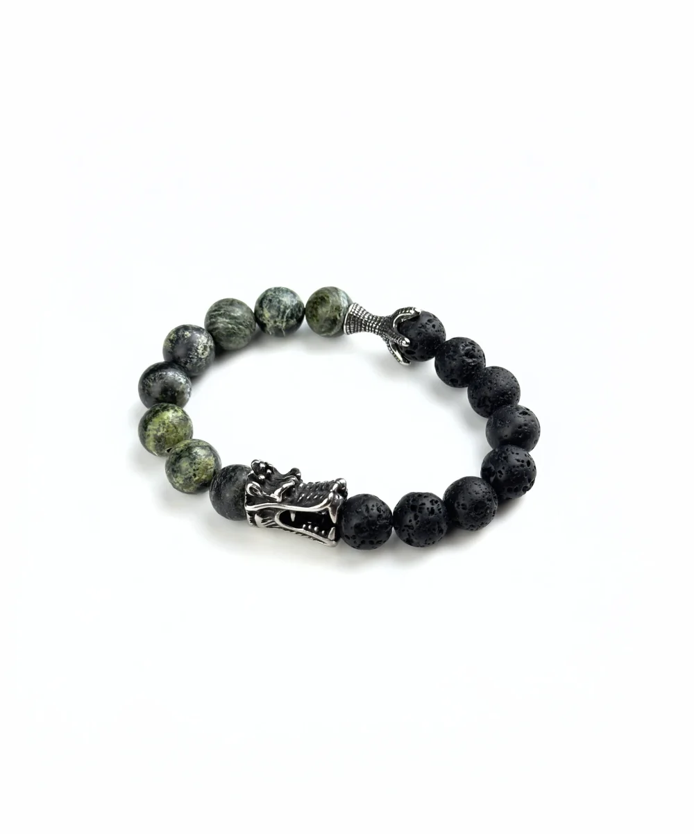 Браслет выполнен из натуральных камней – змеевика и вулканической лавы – и дополнен харизматичными вставками из нержавеющей стали в виде головы и когтя дракона.