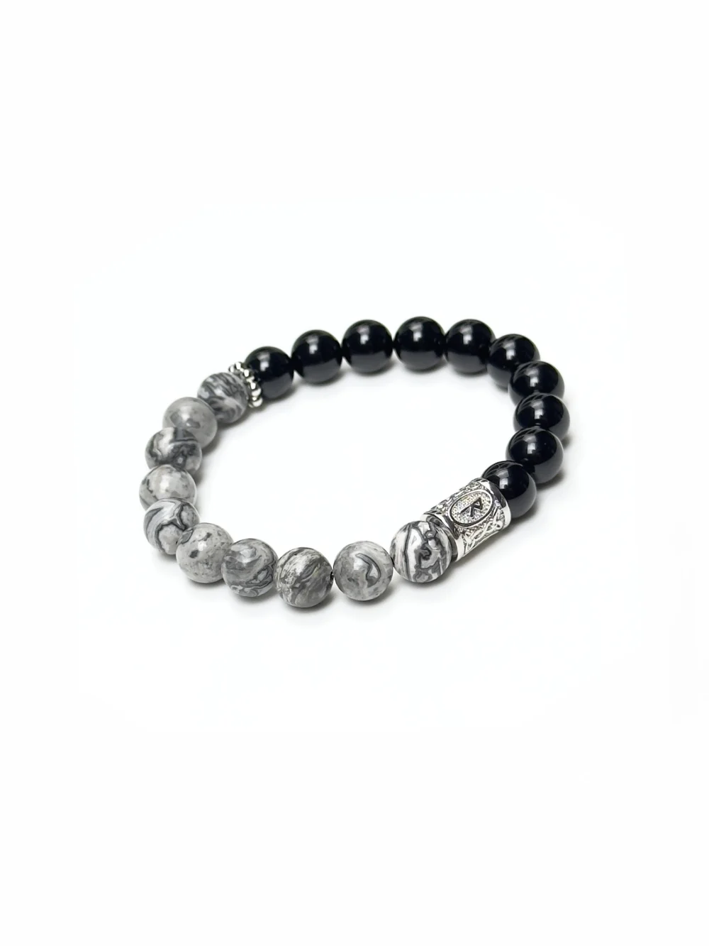 Браслет ПУТЬ 2.0 выполнен из натуральных камней — серой яшмы и черного агата. Этот стильный аксессуар не только украсит ваш образ, но и станет верным спутником на вашем жизненном пути, помогая преодолевать трудности и находить правильные решения.
