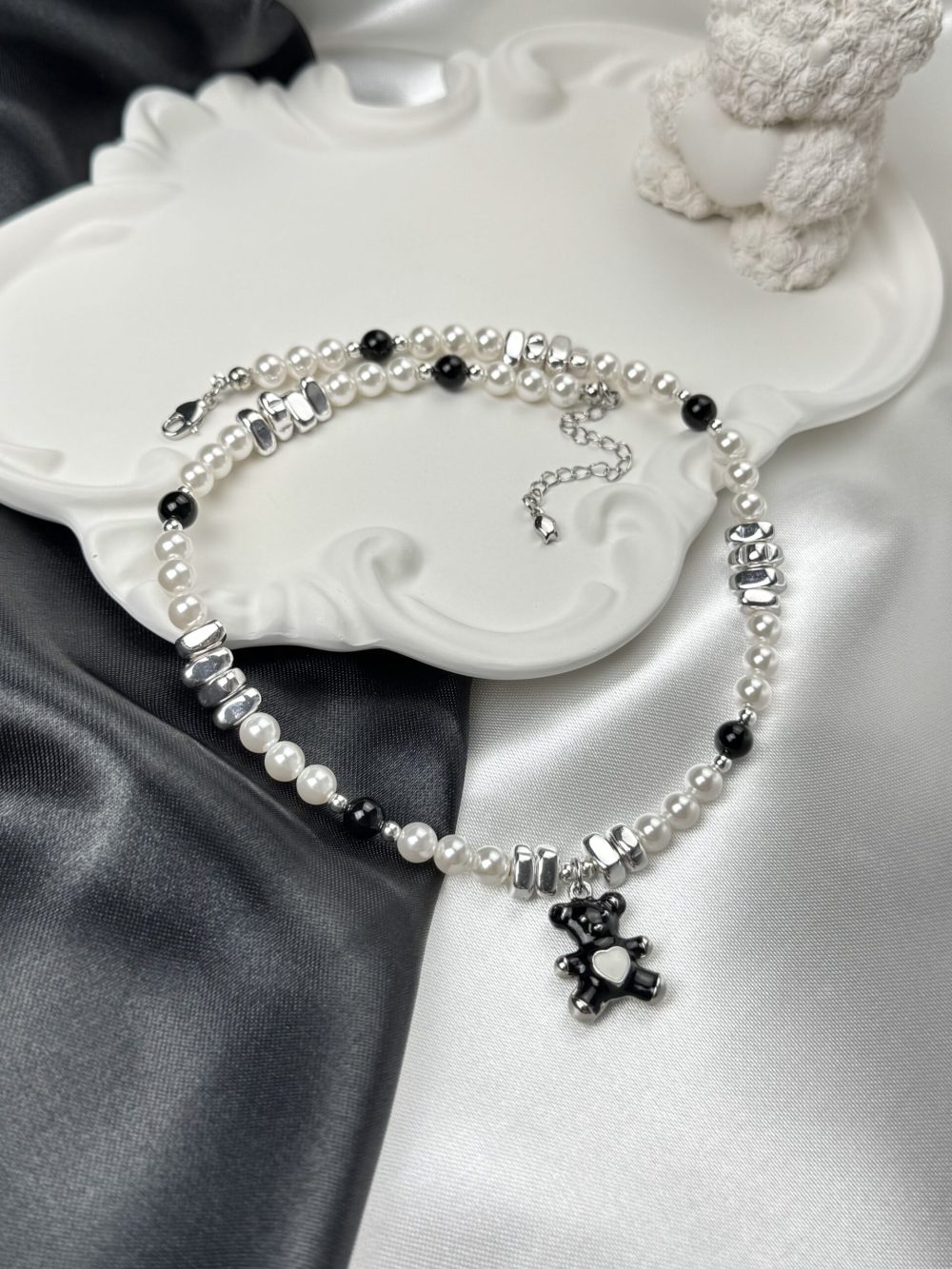 Особым акцентом служит подвеска в виде черного мишки. Эта миловидная деталь добавляет нотку игривости и романтики, делая колье идеальным выбором как для повседневного ношения, так и для особых случаев.