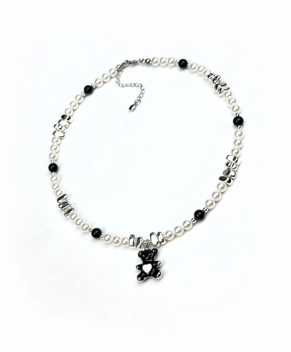 Колье выполнено из высококачественного жемчуга майорка, натурального черного оникса и гематита с сияющим серебристым покрытием и дополнено милой подвеской в виде черного мишки с белым сердечком.